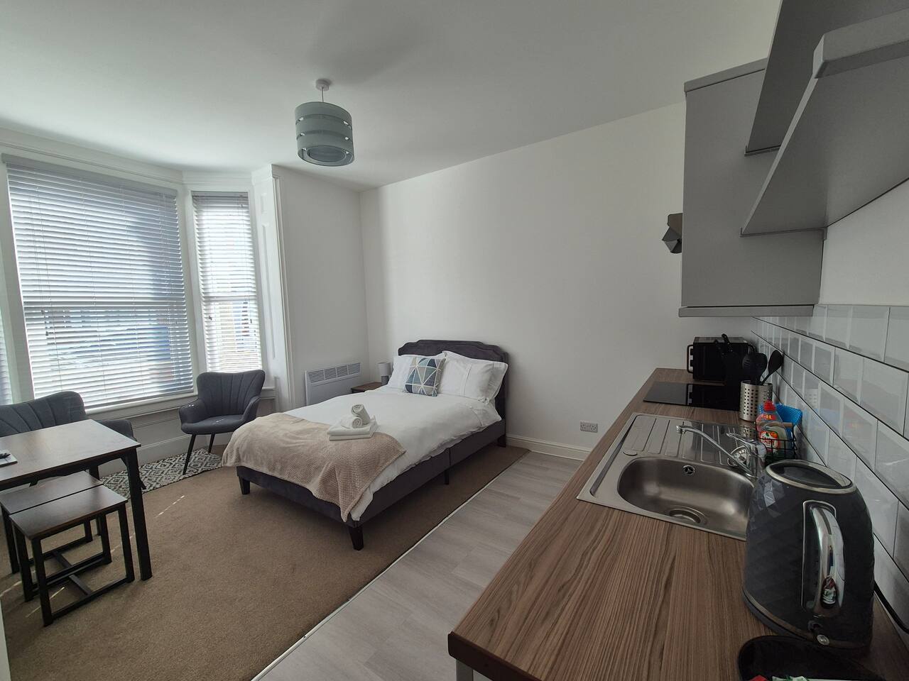The studio is located in a residential area, so we kindly ask guests to be respectful of neighbours, especially during quiet hours. Free on-street parking is available nearby on a first-come, first-served basis. The property is budget-friendly and practical, designed for comfort and convenience rather than luxury. Ideal for short and extended work stays, including contractors and business travellers. Please note the layout is a compact studio, best suited to one or two guests.
