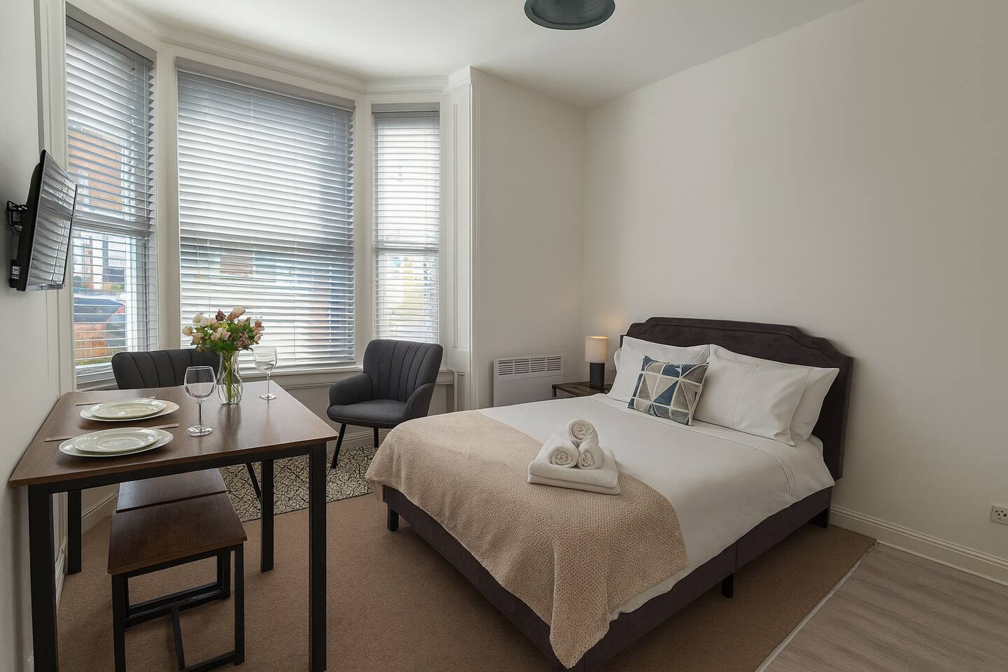 Welcome to this modern 1 bedroom studio apartment in Fratton, Portsmouth, ideal for contractors, business travellers, and short-stay visitors. This stylish and practical space offers everything you need for a comfortable stay, including a cozy double bed, bright open-plan living area, work-friendly layout, and a fully equipped kitchenette — perfect for meals on the go or longer stays. High-speed free WiFi and a Smart TV ensure you can stay connected and entertained throughout your visit. One of the unique advantages of this property is free on-street parking, a rare find in the area and perfect for guests with vehicles (although parking after 5pm can be tricky to find). Located just minutes from the M27 motorway, Fratton Train Station, local bus links, shops, cafes, and takeaways, this studio provides excellent transport connections and convenience for work or leisure travellers alike. Whether you’re here for business, touring Portsmouth, or exploring nearby attractions like Gunwharf Quays and Southsea Seafront, this well-located studio makes a great base for your visit.